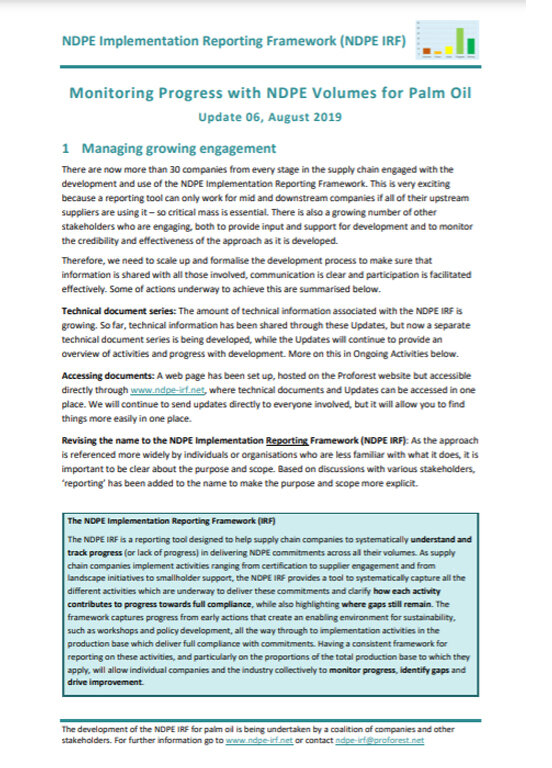 There are now more than 30 companies from every stage in the supply chain engaged with the development and use of the NDPE Implementation Reporting Framework. This document provides an update on the most recent developments on the IRF tools. It also covers the adoption of the Implementation Reporting Framework as the tool’s official name.